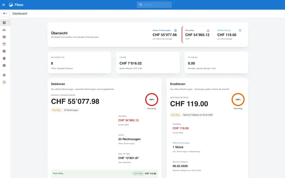 Schweizer KMU Software für Buchhaltung, Lohnabrechnung, Zeiterfassung, Mitarbeitende, Aufträge, Lieferscheine und QR-Rechnungen. Mit KI-Assistent für wiederkehrende Administration.