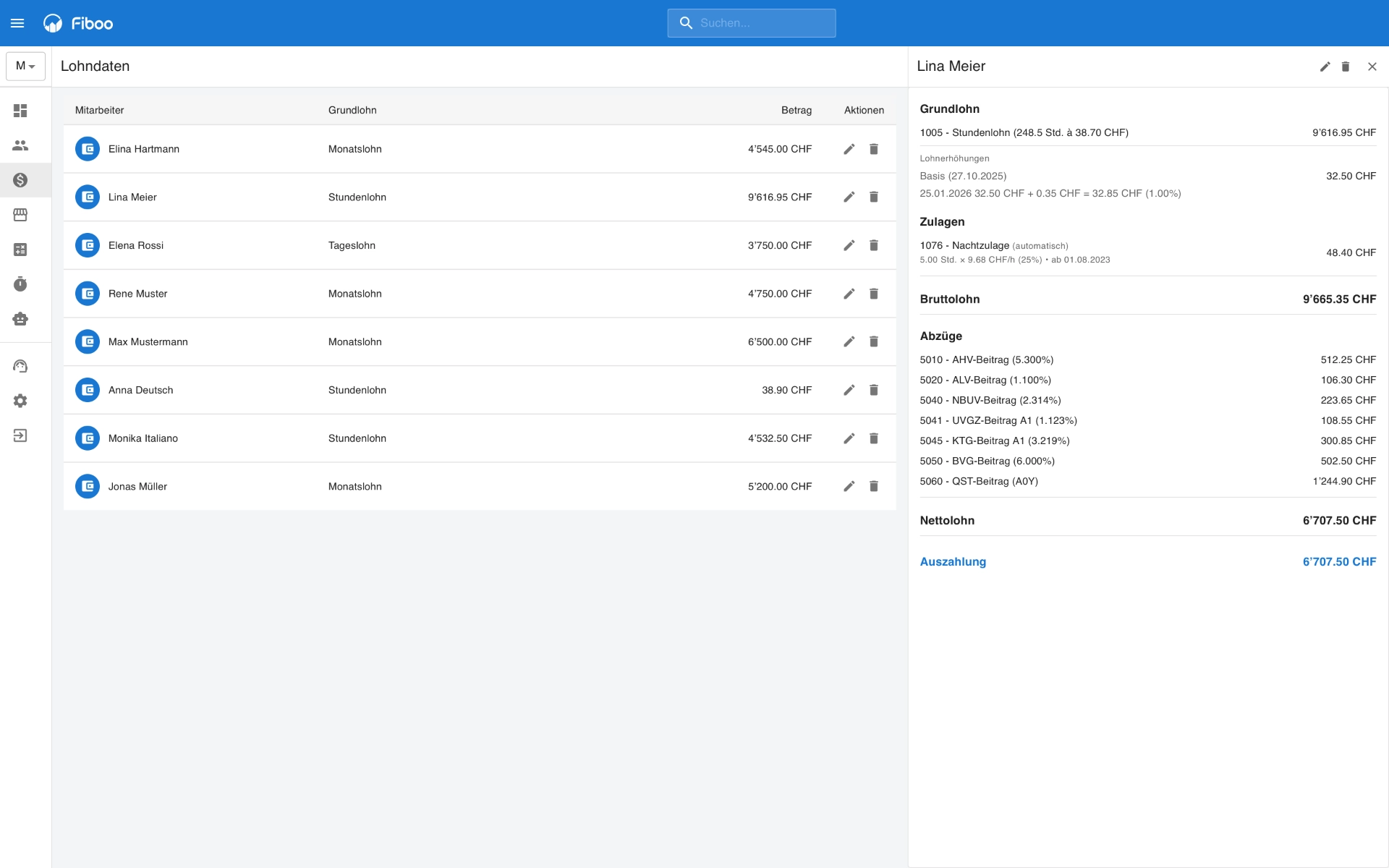Schweizer Lohnsoftware für KMU: Monats- und Stundenlohn, Quellensteuer, AHV/ALV, Kinderzulagen, Lohnausweis und pain.001-Zahlungsdatei für Lohnzahlungen.